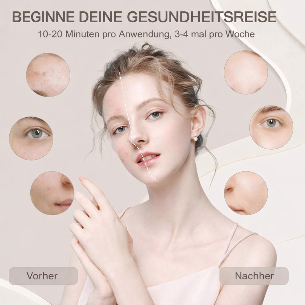 Triple-Spektrum-Technologie: Nutzt 620nm, 680nm und 860nm (NIR) Wellenlängen, um sowohl die Hautoberfläche zu glätten als auch tiefere Gewebeschichten zur Regeneration anzuregen.