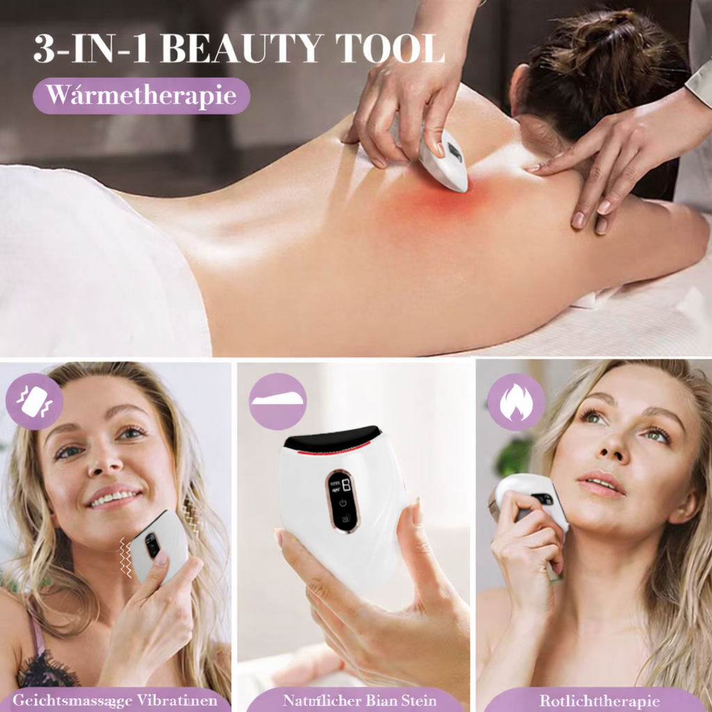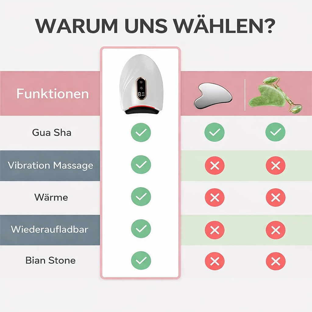 Im Gegensatz zu herkömmlichen Tools kombiniert es Wärme, LED-Licht, Vibration und Bian-Stein in einem Gerät – für tiefenwirksame, sichtbare Ergebnisse statt nur oberflächlicher Massage.